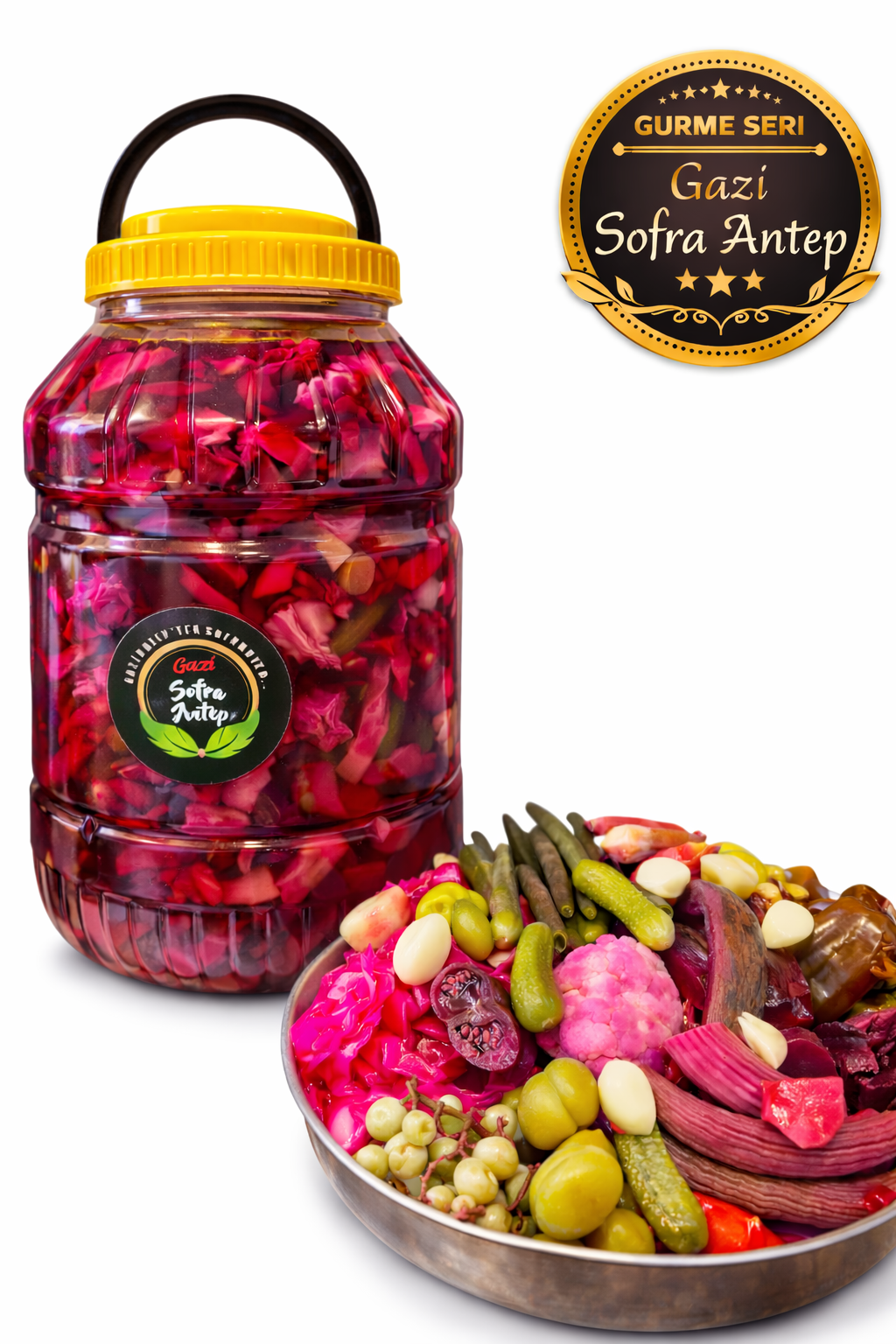 İçindekiler : Kornişon, acur, bamya,karnıbahar,beyaz lahana ,mor lahana, Erik,çağla , diş sarımsak,baş sarımsak ,semiz otu,yeşil biber,kapya biber ,tatlı biber ,acı biber,pancar,koruk,domates ,yeşil fasulye ,bamya,kelek,limon ,sarı kiraz biber bulunmaktadir.ideal tuz oranına sahiptir